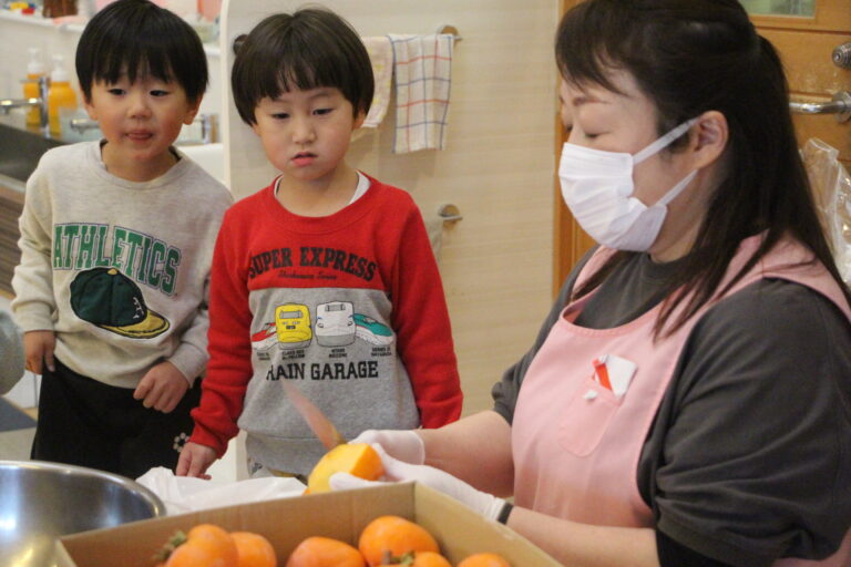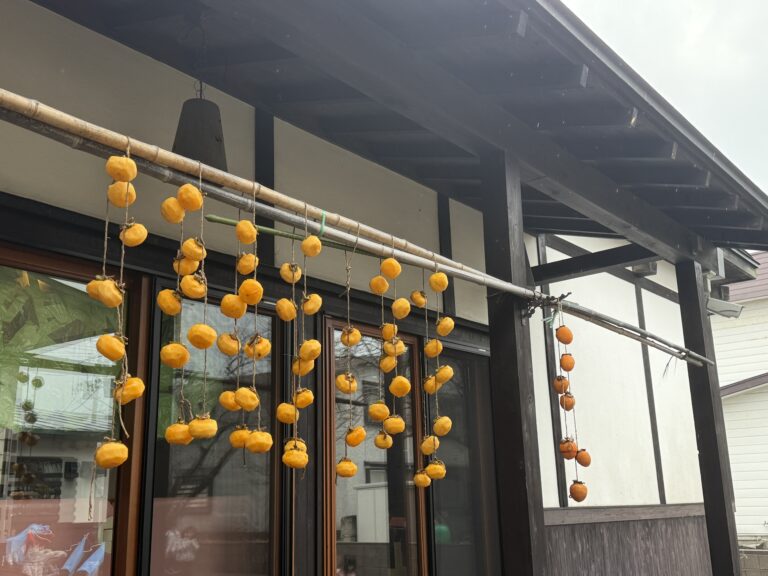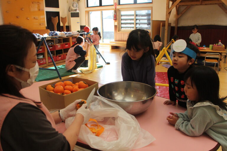 干し柿を食べた子どもたちの表情と感想を楽しみに、冷たく寒い子民家の軒下でつるされた渋柿が、甘く美味しい干し柿となるその変化、大きかった柿がどのくらいの大きさになるのか、鮮やかなオレンジ色の色の変化なども子どもたちと楽しんで見守りたいと思います。