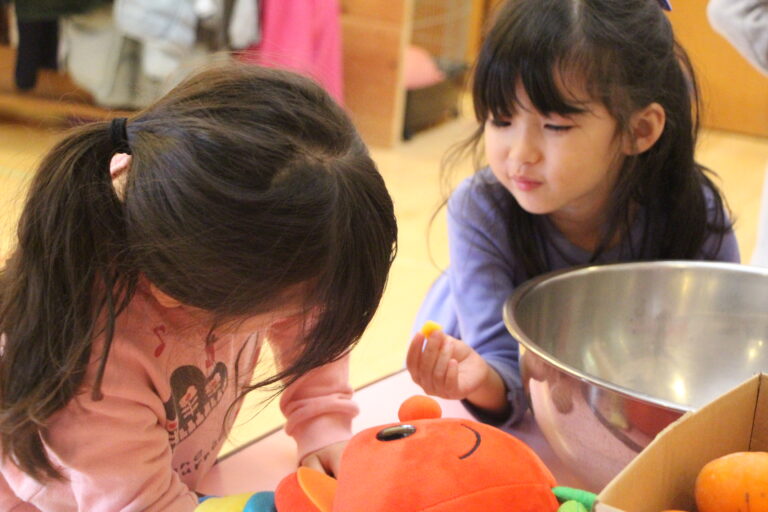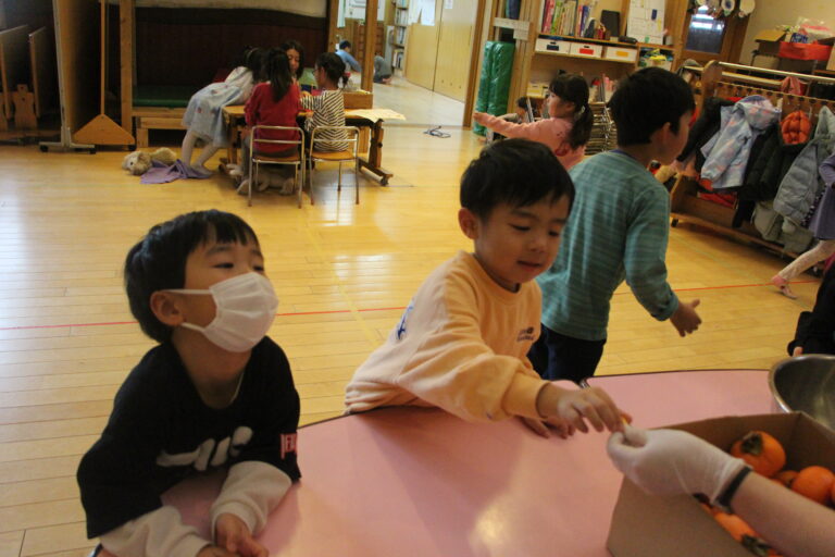 そこで、子どもたちに小さく切った柿を手渡しました。