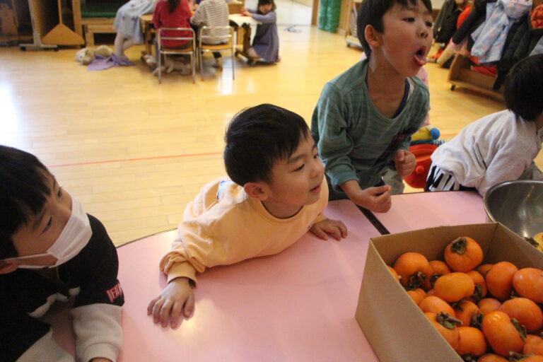 子どもたちと一緒に柿の皮をむいていると「たべたいな」「食べてみたいな」と熱い視線と共に熱い思いが伝わってきました。