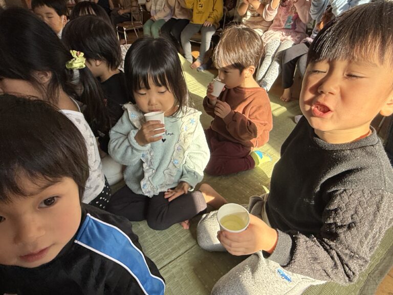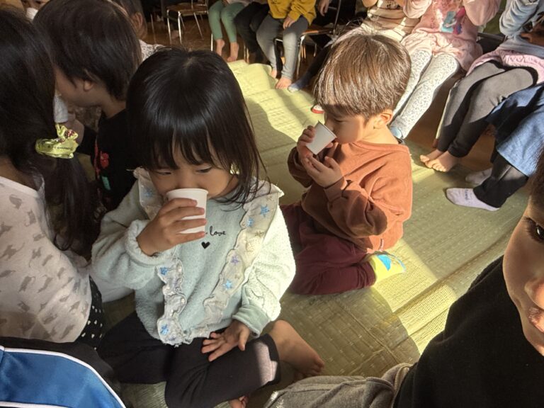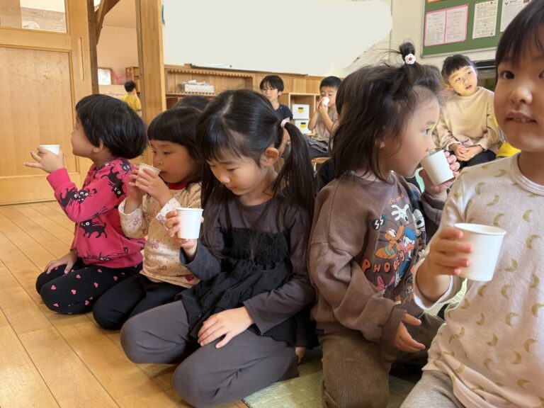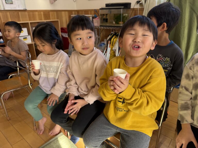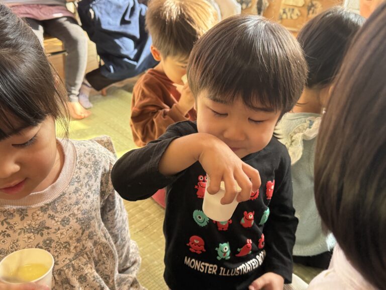湯気が立ち上がるホット柚子を眺めながら冬至について子どもたちと話をしました。