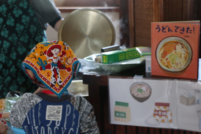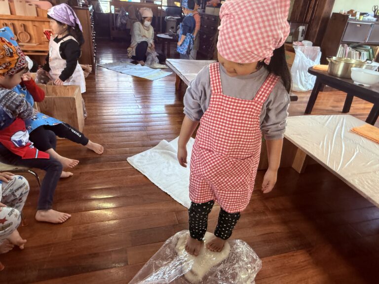 「今日はうどん作り。うどん作りの時はみんなの足の力がおいしくなるのよ」と伝えると