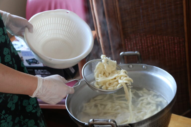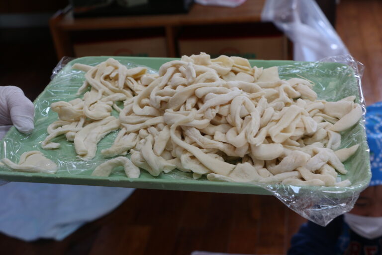 自分たちで作ったうどんのおいしさに「おいし~い」