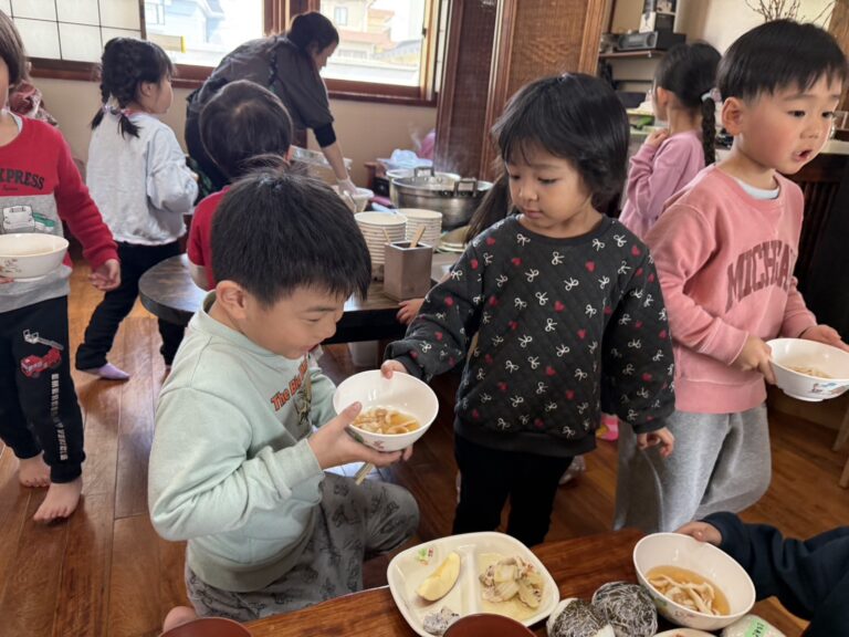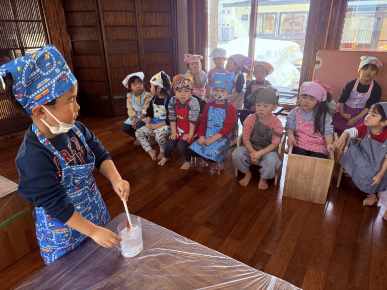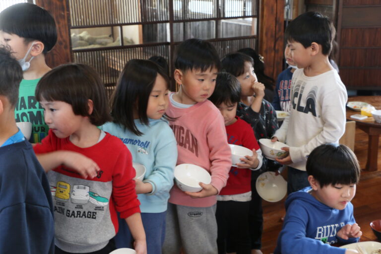 一生懸命作ったうどんを「おいしい、おいしい」とみんなが食べてくれご満悦な3歳児さんたちでした。