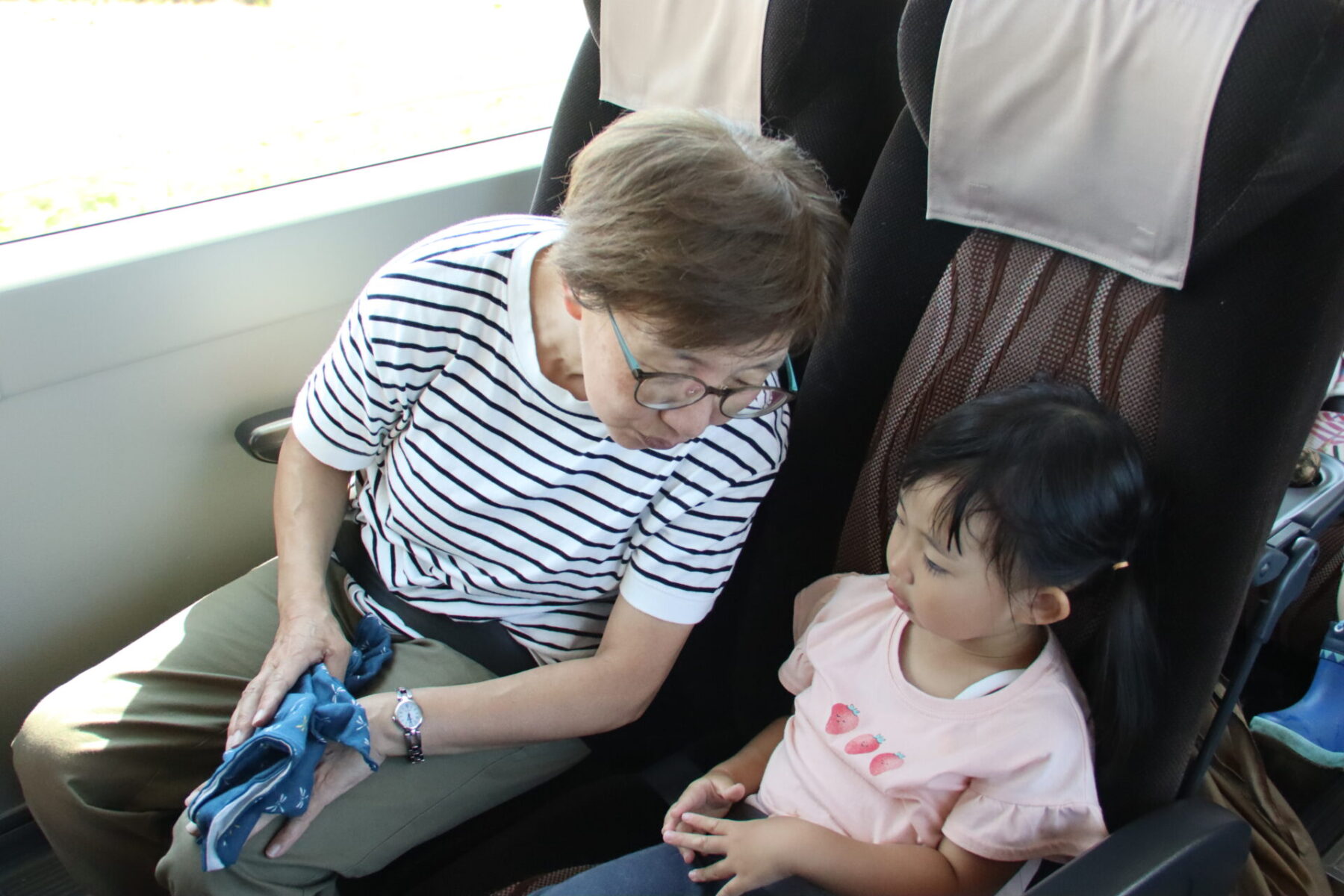 お父さん、お母さんやおばあちゃんと一緒に、黄色い大型バスに乗って