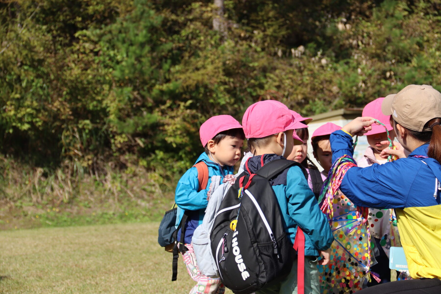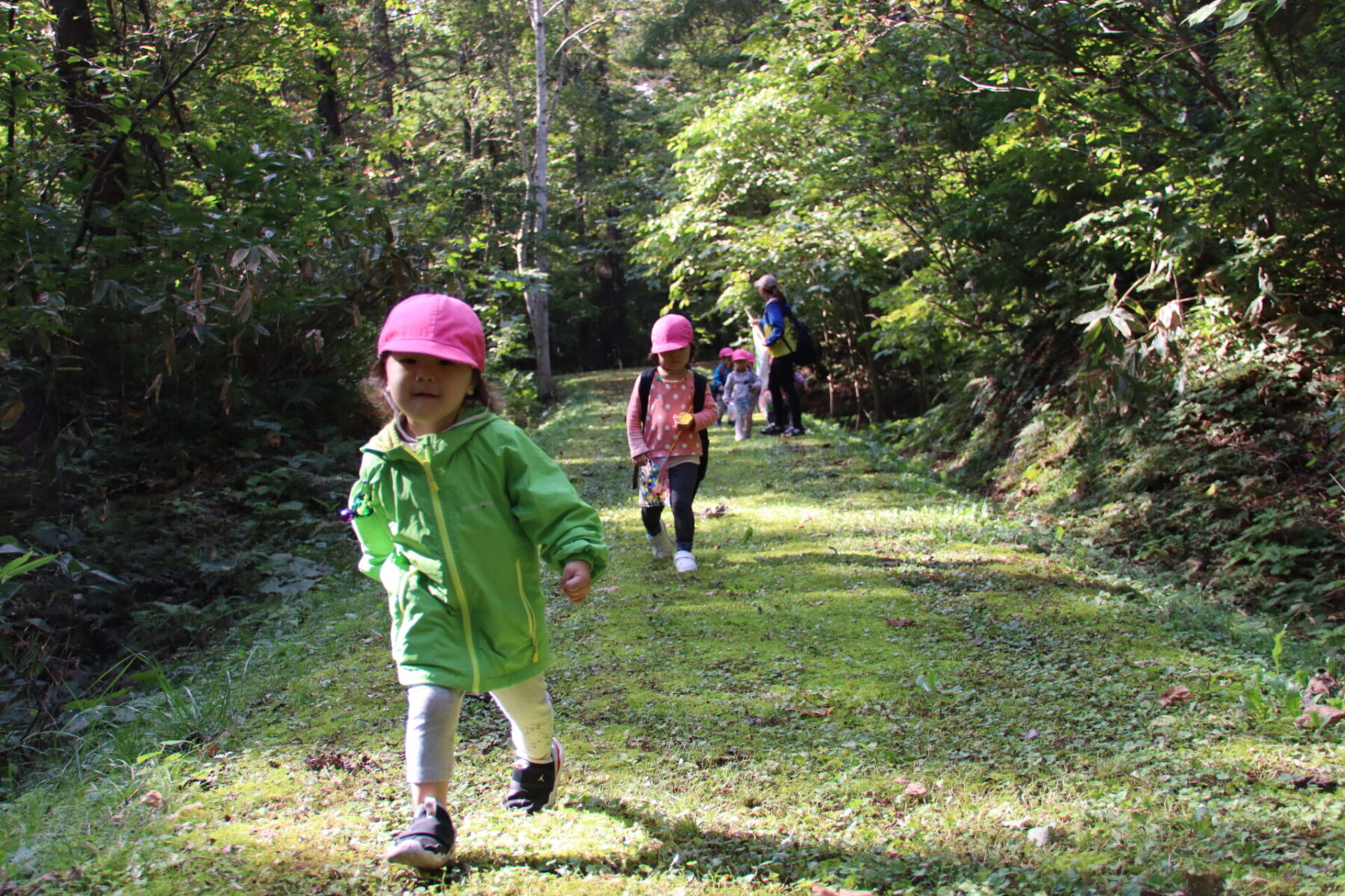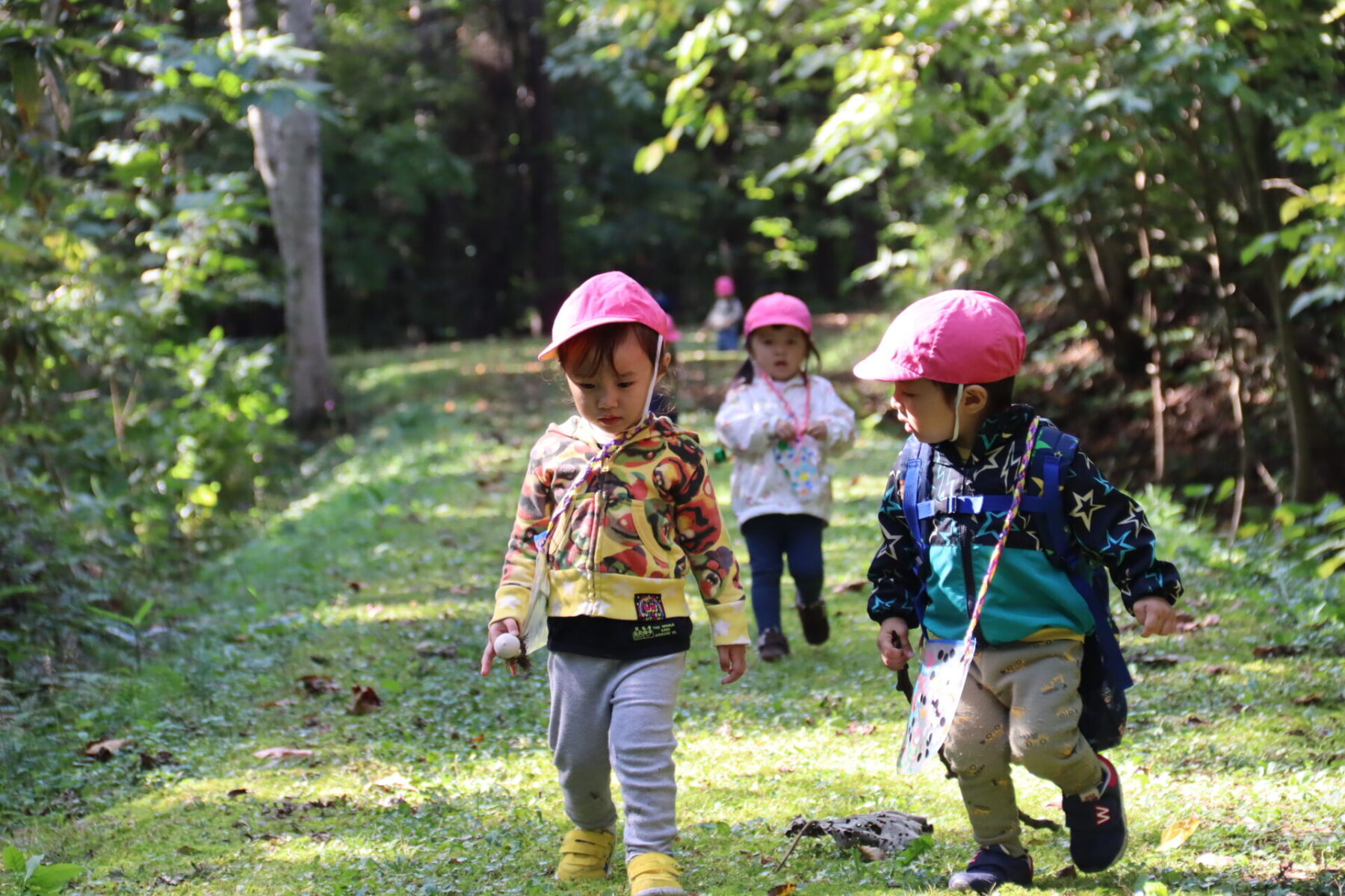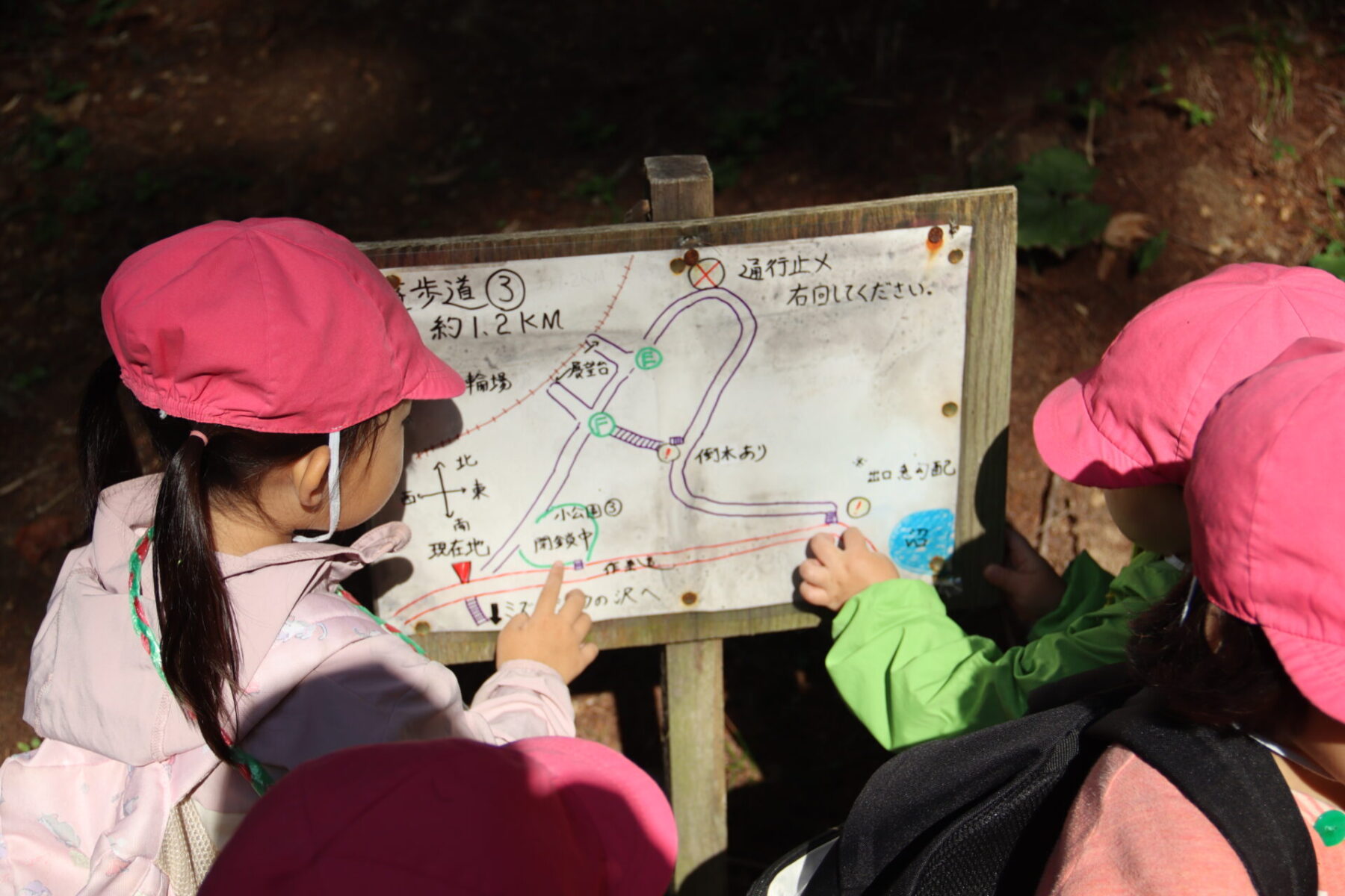森の広場に初めて一緒に行くお友だちに道を紹介する子