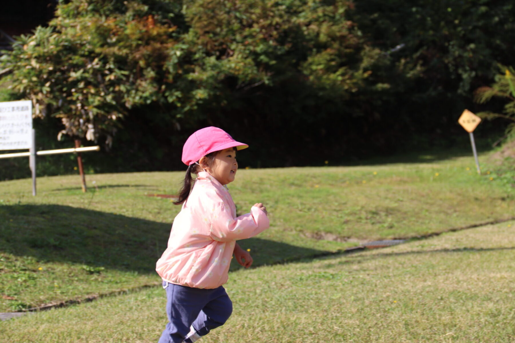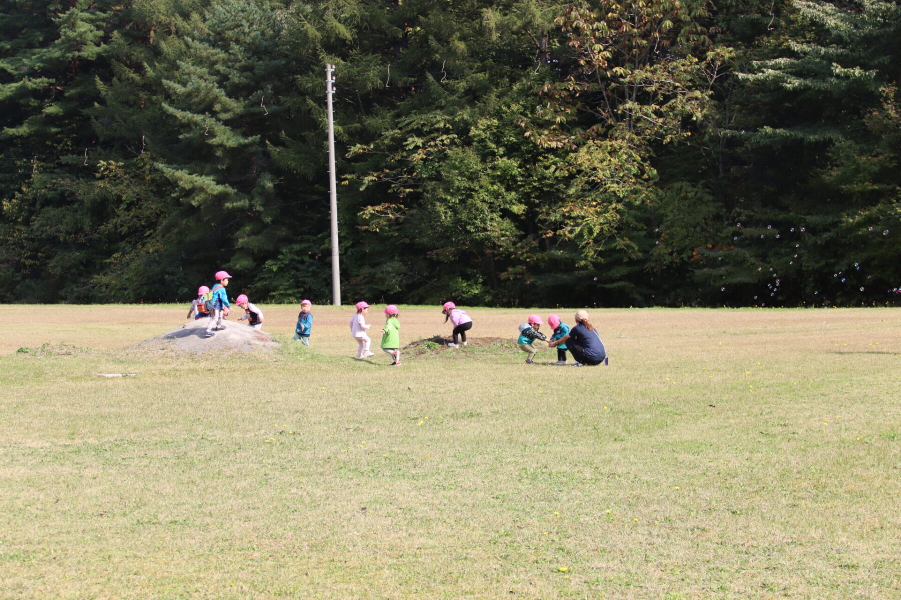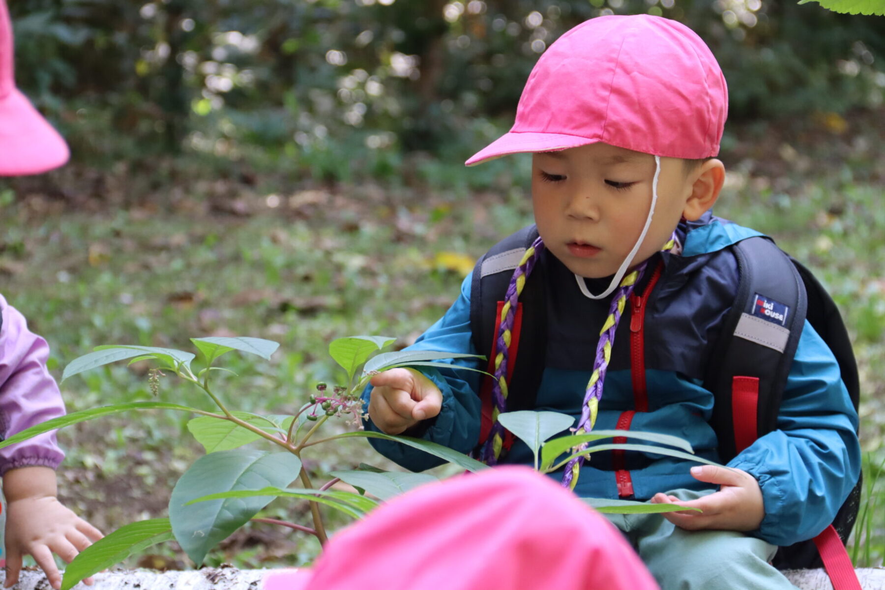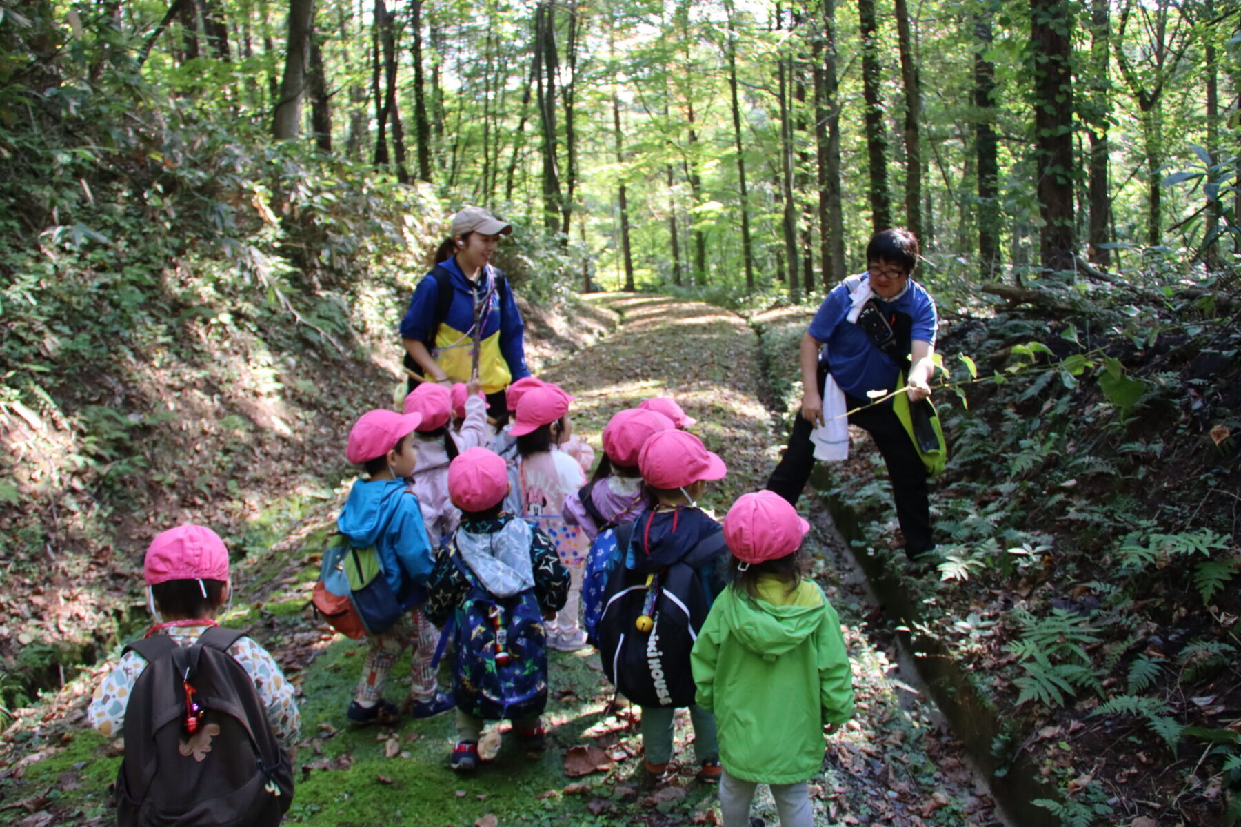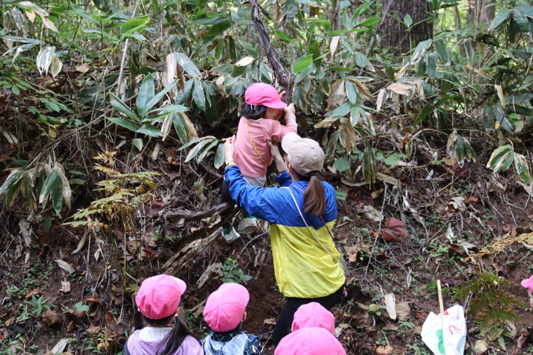 森の広場に初めて一緒に行くお友だちに道を紹介する子