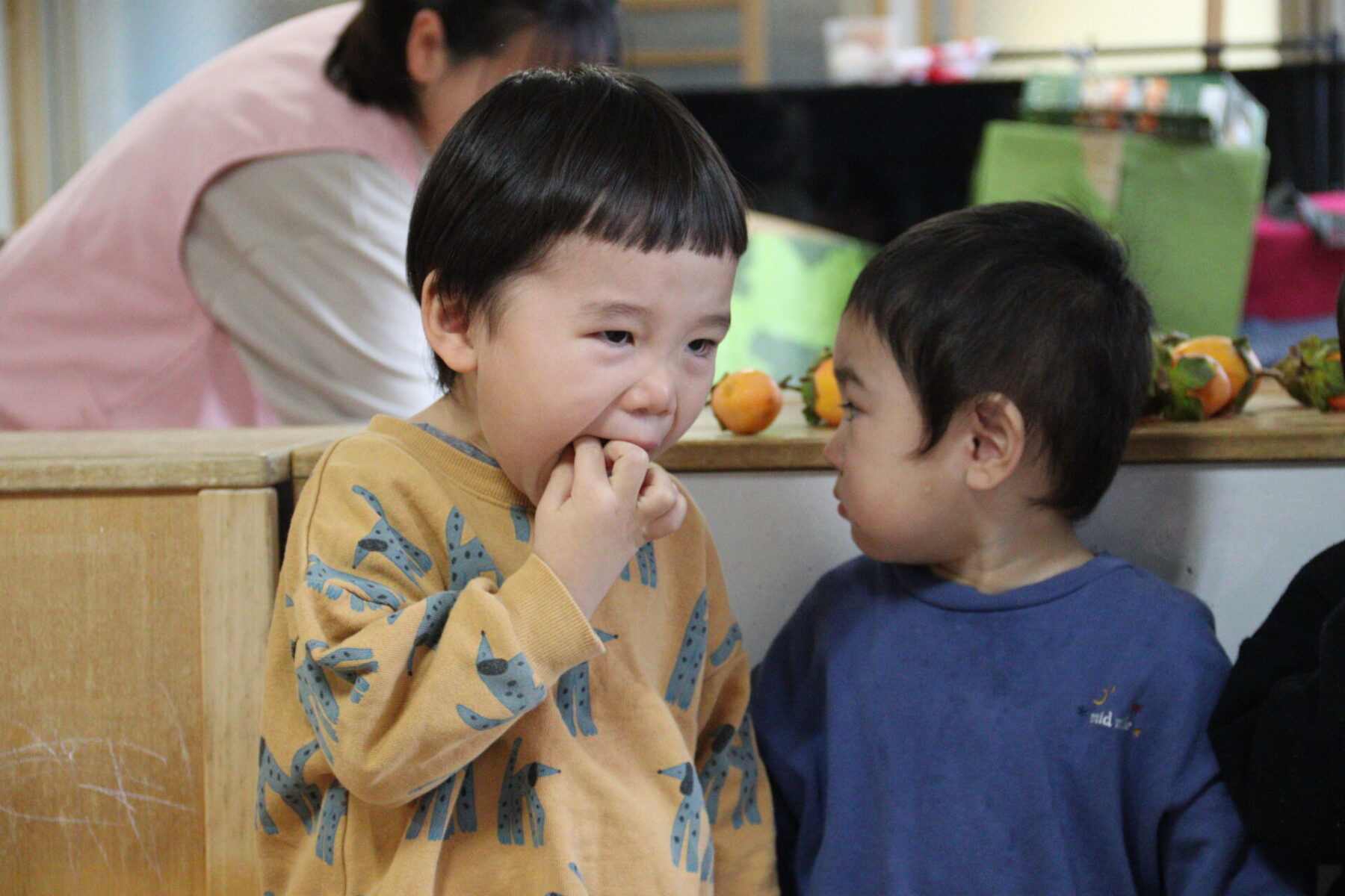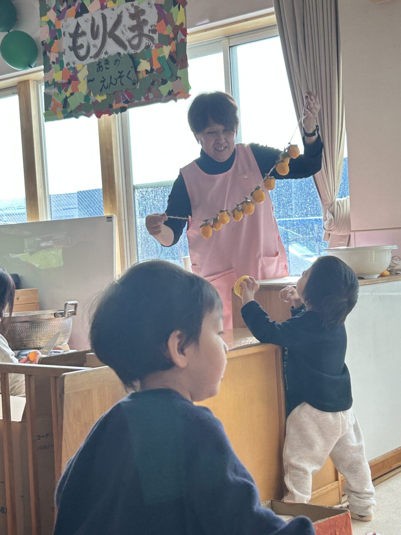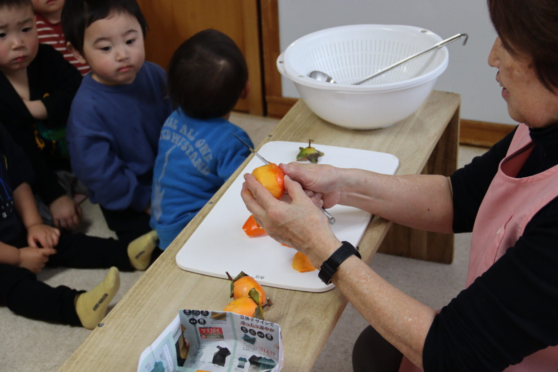 いつも保育園の子どもたちを見守ってくれている柿の木が 実をつけました。 収穫し、食べてみると