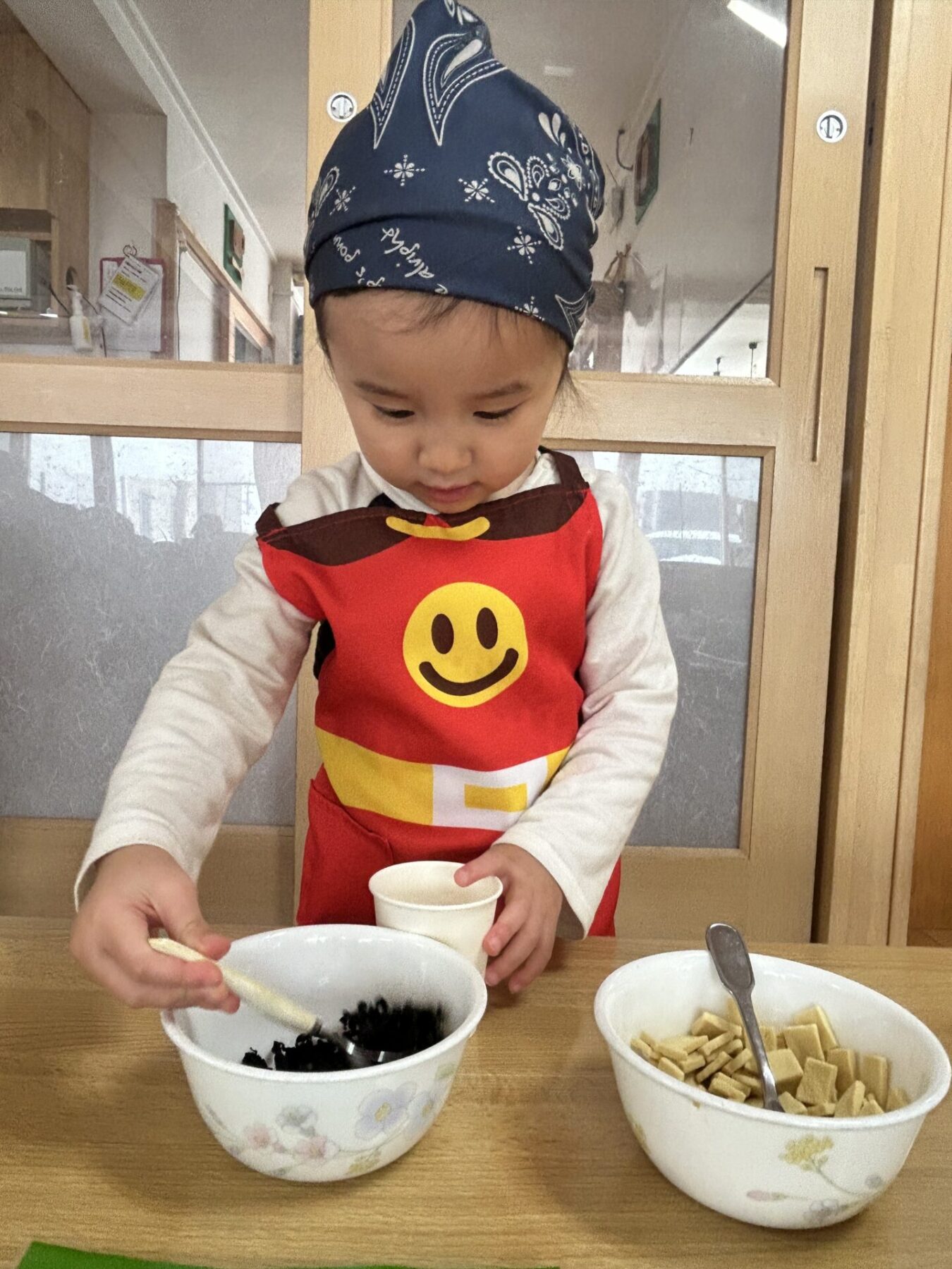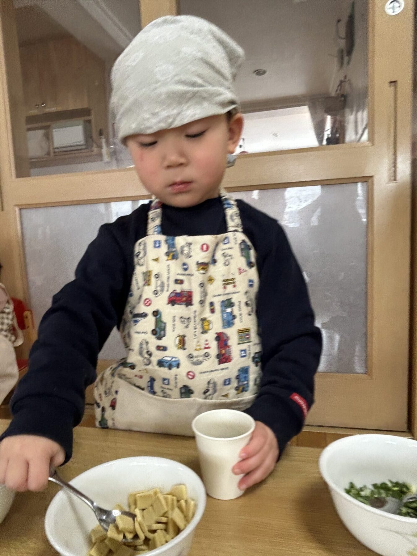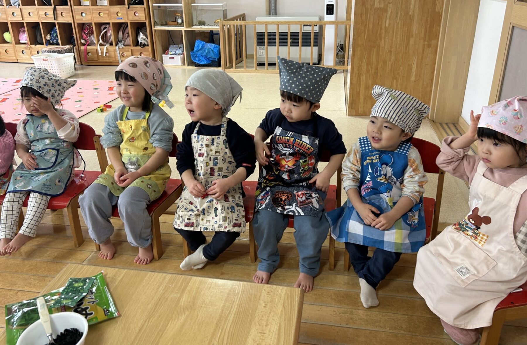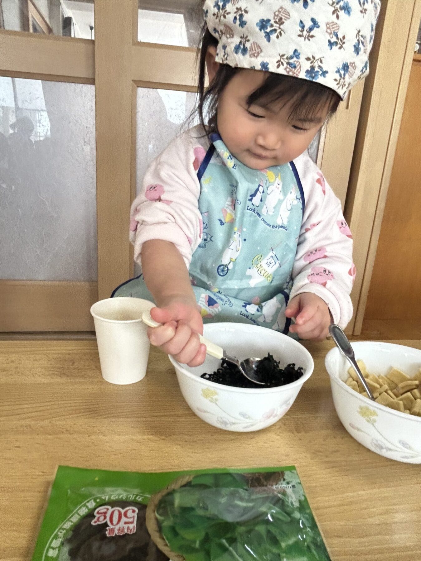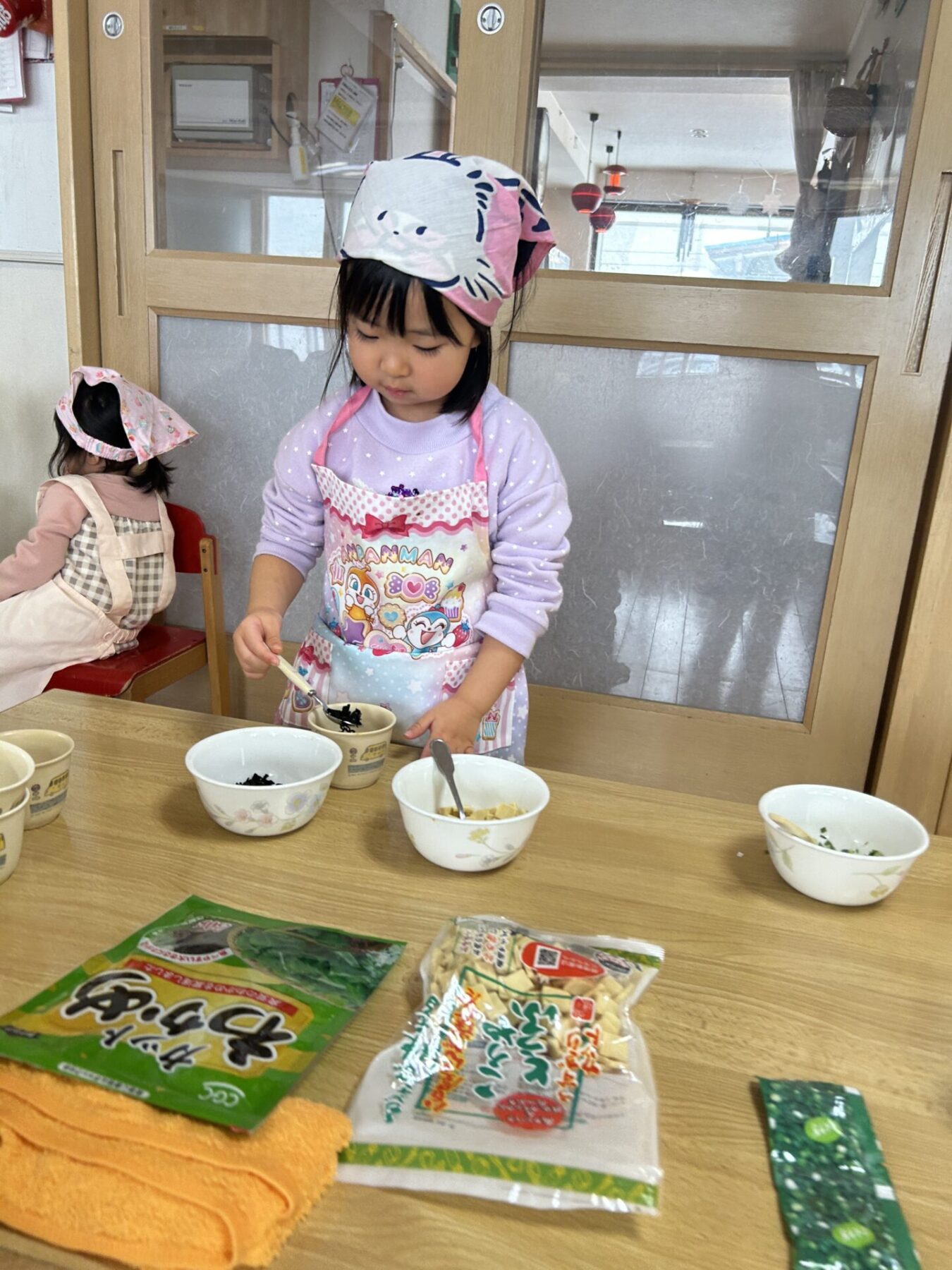登園すると「エプロン持ってきたよ♪」と嬉しそうに話し、朝の準備を始めます。