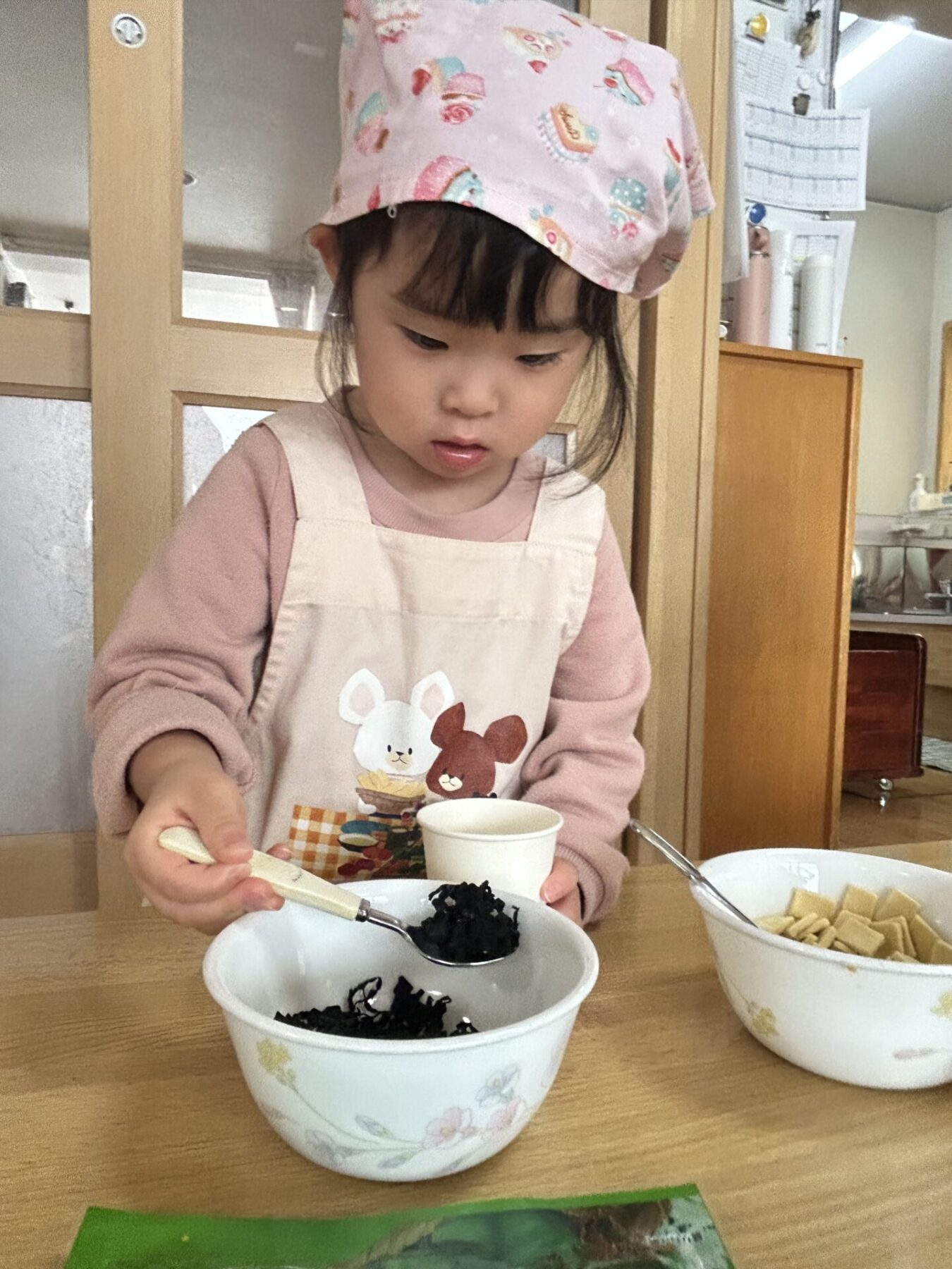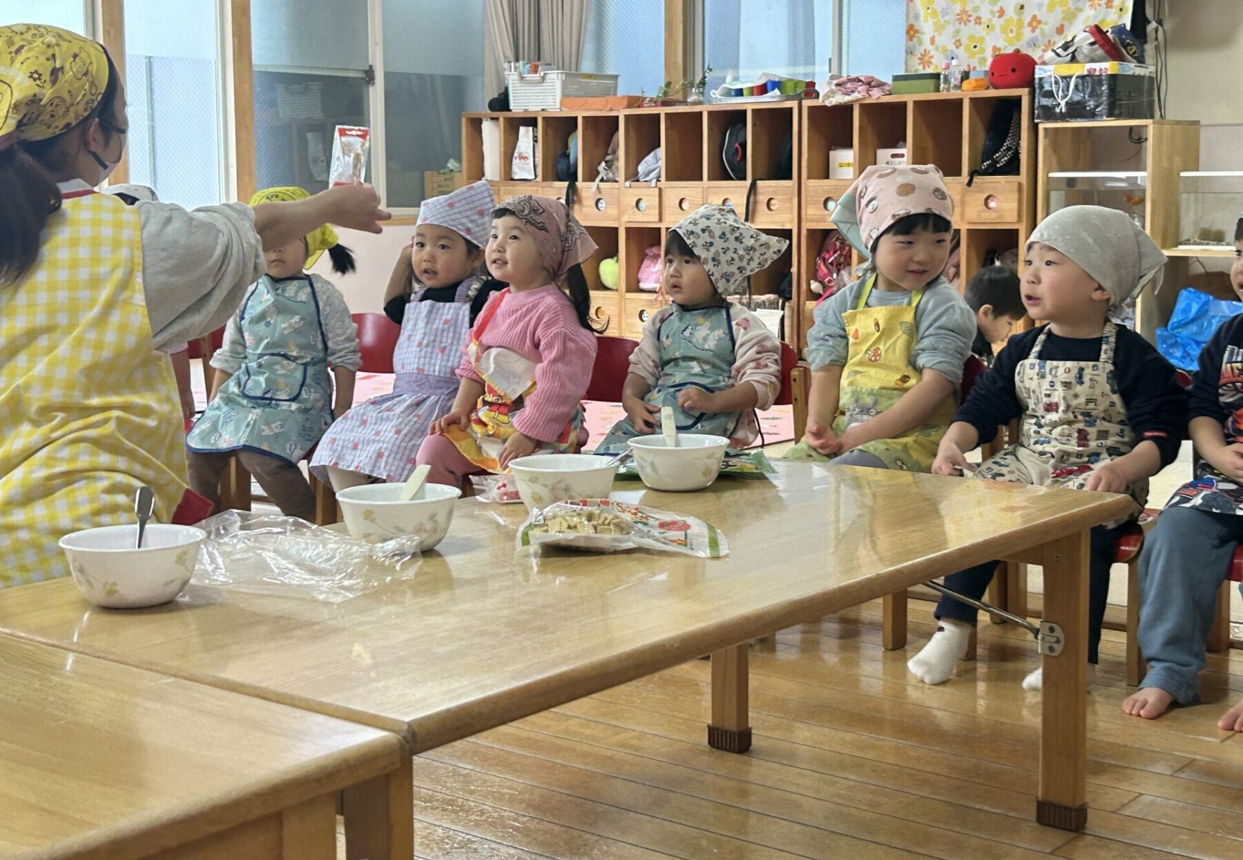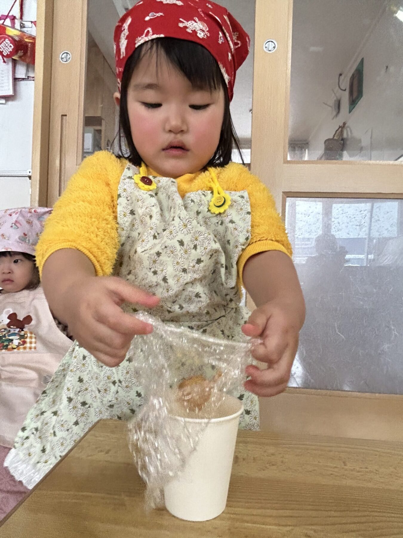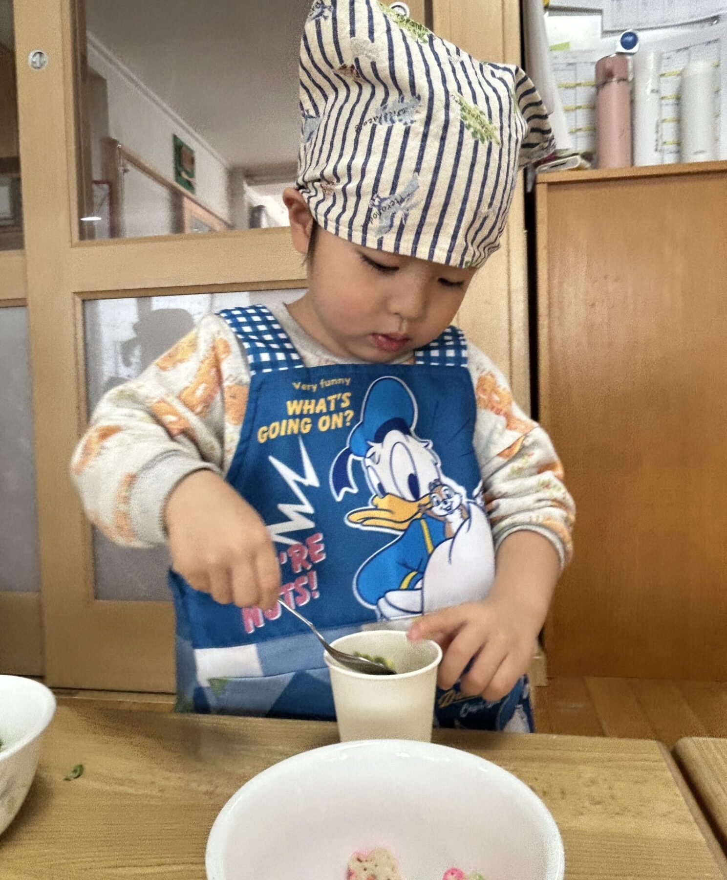 登園すると「エプロン持ってきたよ♪」と嬉しそうに話し、朝の準備を始めます。